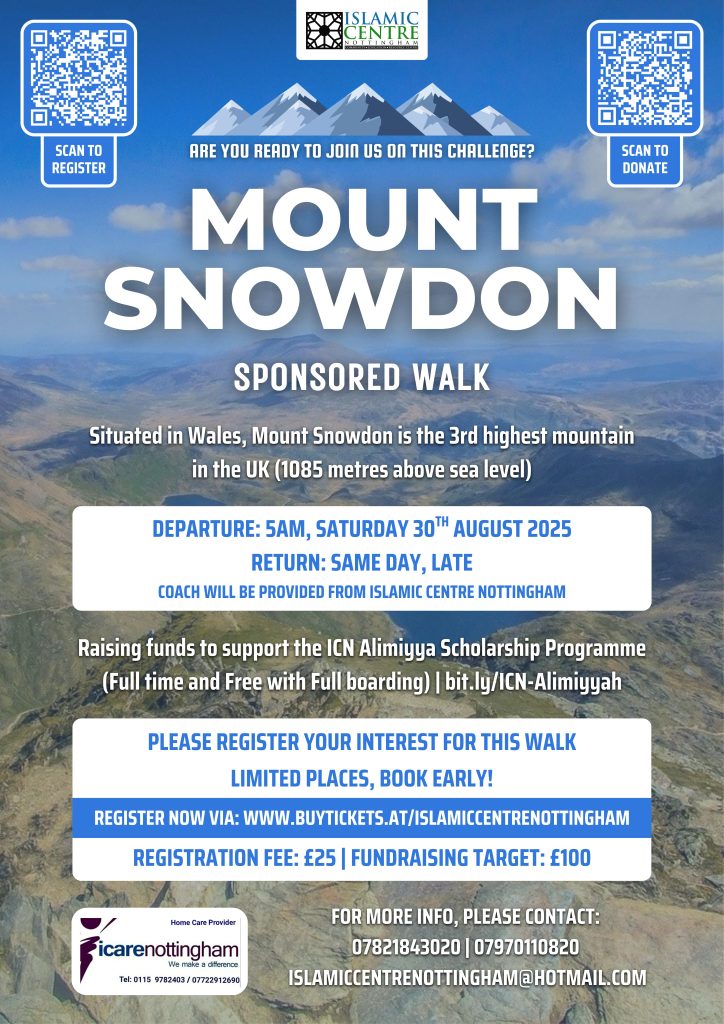 Only 2 weeks to go Mount Snowdon Sponsored Walk on Saturday 30th August 2025 Are you ready for a challenge? Book your place now A sponsored walk up the magnificent Mount Snowdon in Wales has been arranged to raise funds for the ICN Alimiyya Scholarship Programme. This event is open to all. Are you willing […]